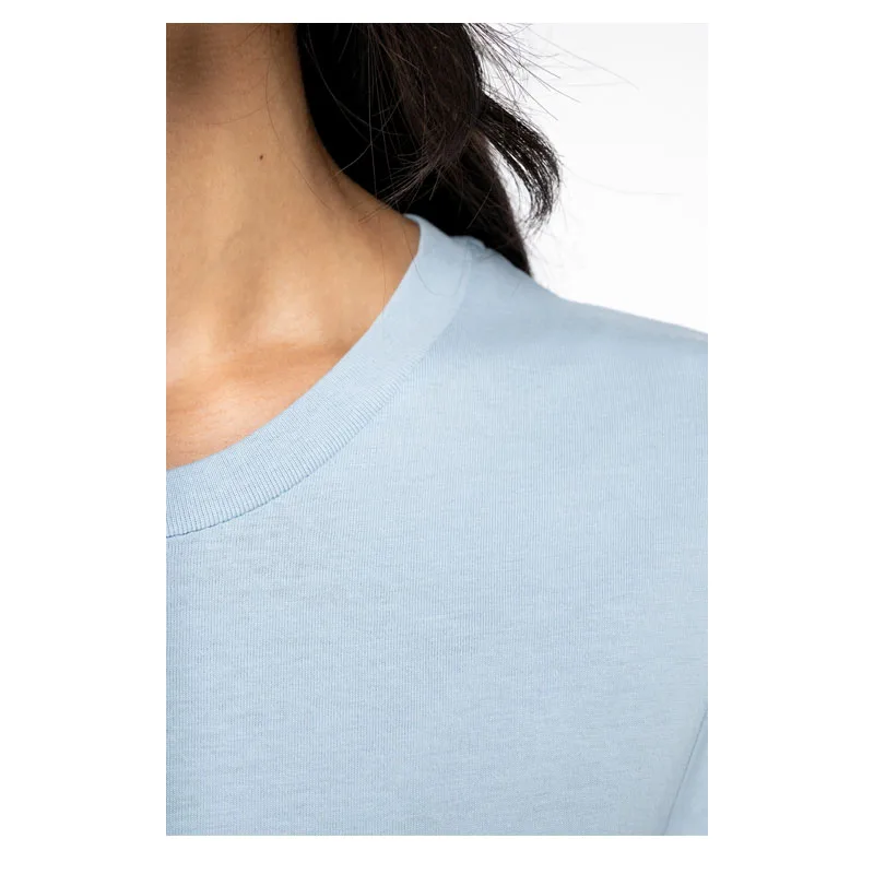Pespontos duplos no acabamento da manga e do cós. Malha rib 1×1. Tapa costuras em jersey à cor no decote.