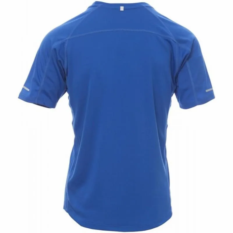 T-shirt técnica-desportiva de homem com mangas raglã, costuras laterais duplas para um ajuste mais confortável, parte inferior ajustada e mais longa nas costas, aplicação refletora nas mangas e atrás da gola, com aba de proteção na gola em cor contrastante, etiqueta de transferência.