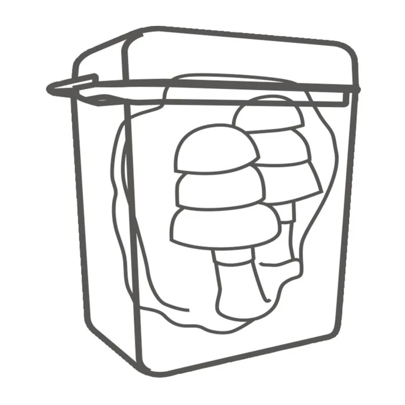 Caixa com 50 pares de tampões auriculares reutilizáveis em TPR com cordão têxtil.