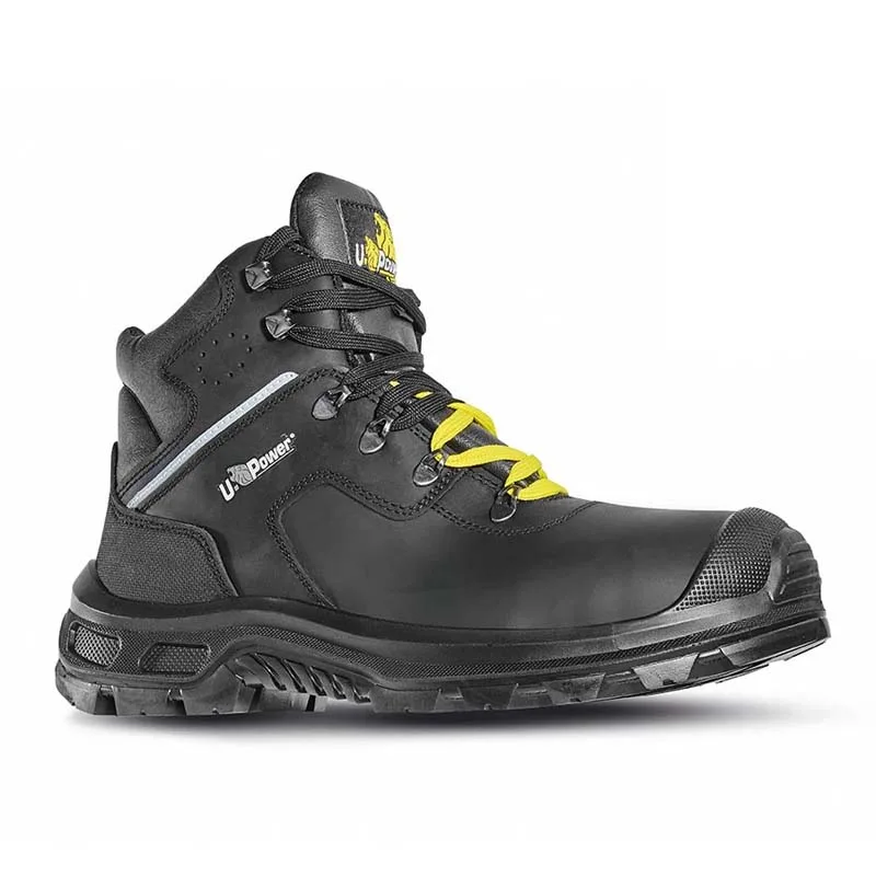 Calçado anti-estático, repelente de água em couro macio, extremamente robusto, Pull-up, resistente à abrasão e tração dinâmica. Scuff Cap reforçado com PU na frente e com renda dupla amarela e preta.