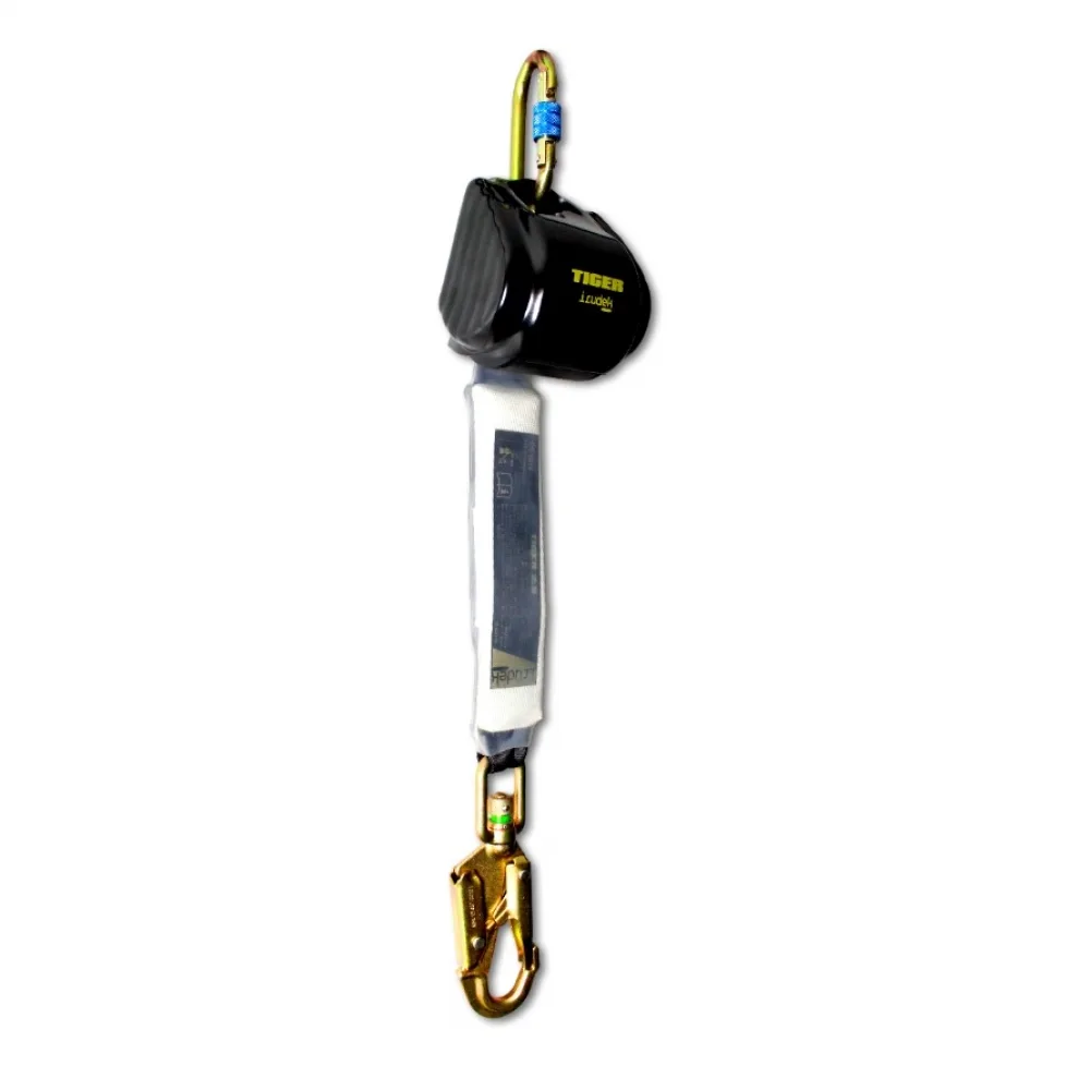 Inclui absorvedor de energia + 1 mosquetão de aço com fecho de rosca na parte superior + 1 mosquetão giratório automático de aço novo com indicador de queda na extremidade do absorvedor para evitar que a correia se enrosque durante o uso.